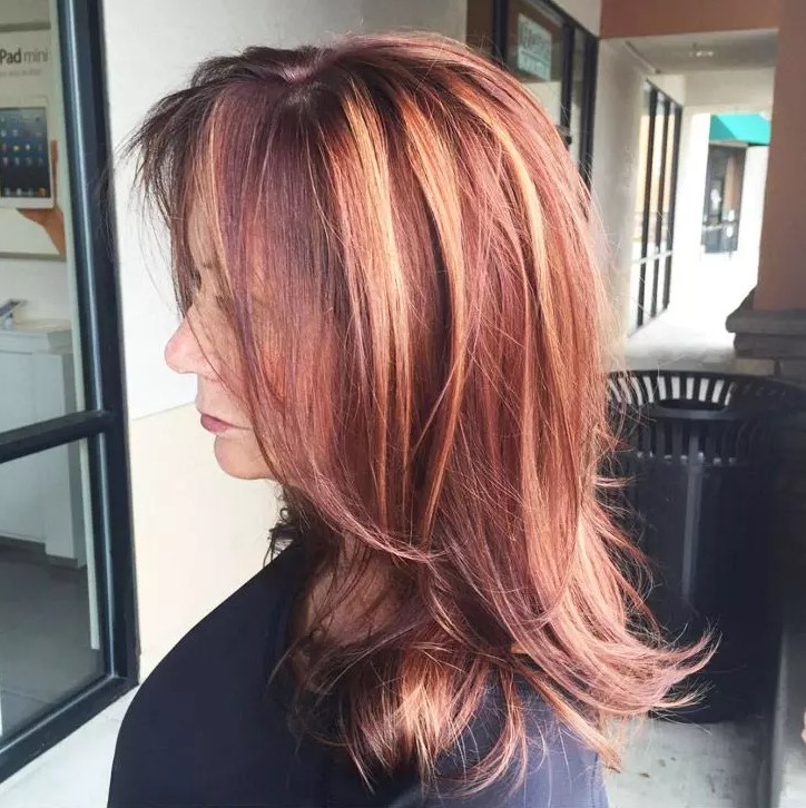 Cette coupe de cheveux séduisante est la bonne pour les femmes nées pour être sexy. Cela prouve que les coiffures pour les femmes de plus de 50 ans ne doivent pas être ennuyeuses. Avec les couches mi-longues et recadrées, ajoutez une couleur de base rouge avec des reflets blonds pour rafraîchir votre look.